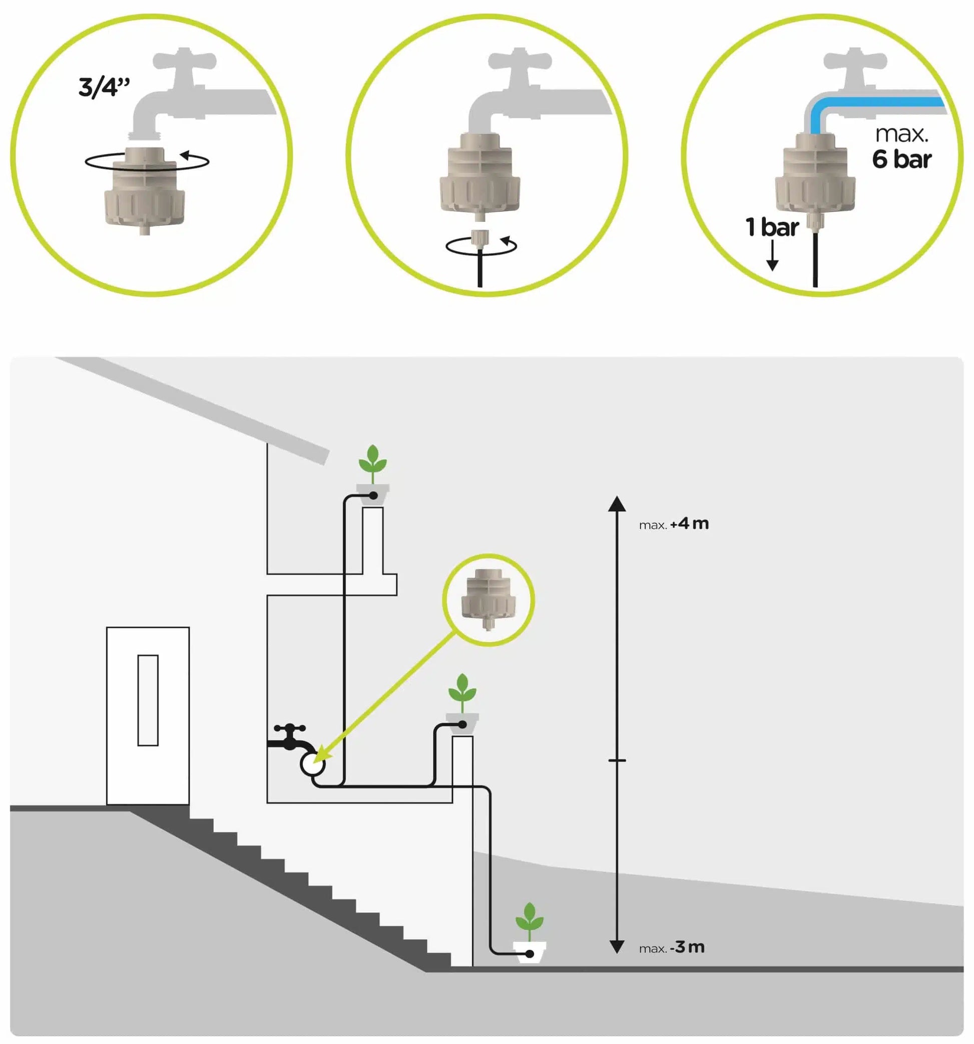 The pressure reducer allows you to connect the Blumat irrigation system to the tap, instead of a rain barrel. A single pressure reducer can connect 250-300 Blumats (Blumat sensors) over a distance of approximately 50 meters.