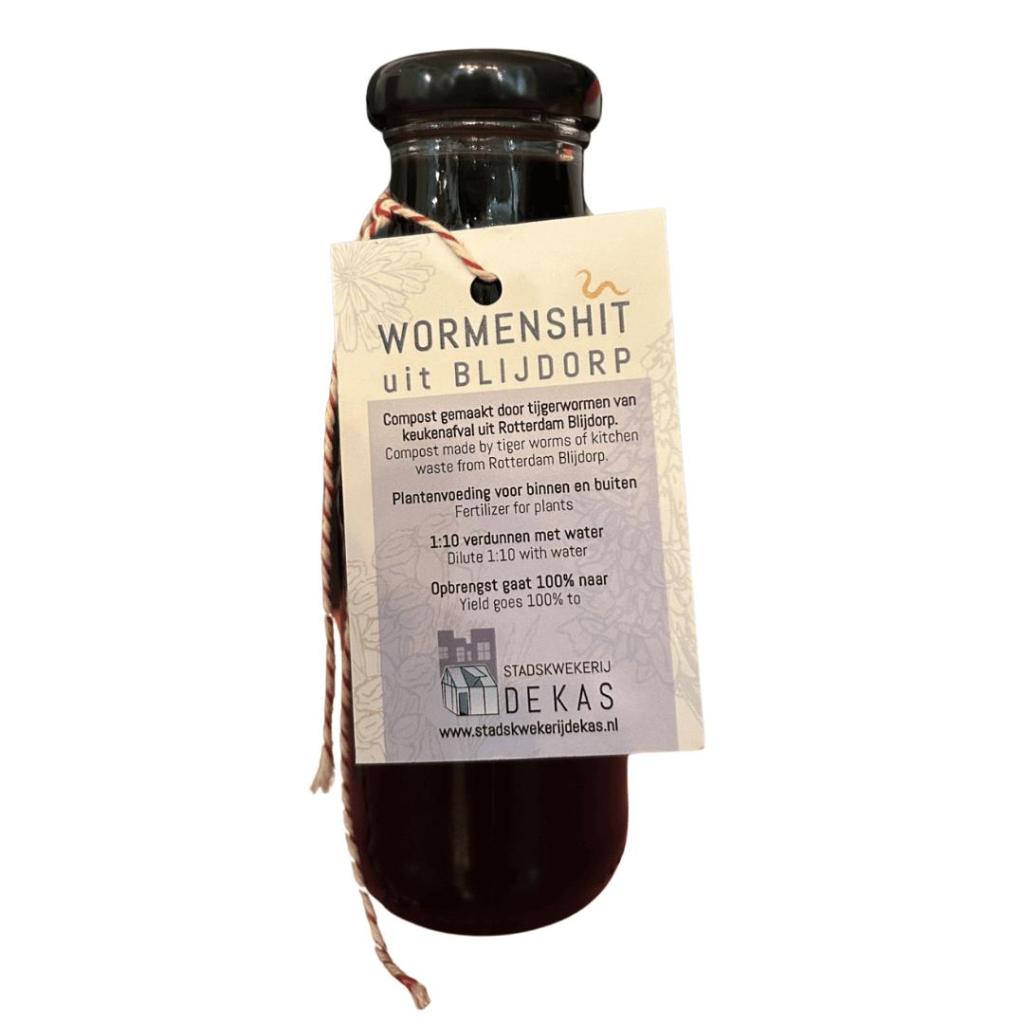 Geef je planten een natuurlijke boost met deze vloeibare wormenmest, rechtstreeks uit het wormenhotel in Blijdorp. Deze wormenshit zit boordevol mineralen en voedingsstoffen die zowel je kamerplanten als tuinplanten laten stralen. De wormen worden gevoed met groenten-, fruit- en keukenafval van buurtbewoners. Wat zij produceren, vangen wij op: rijk verteringsvocht, perfect als vloeibare plantenvoeding.